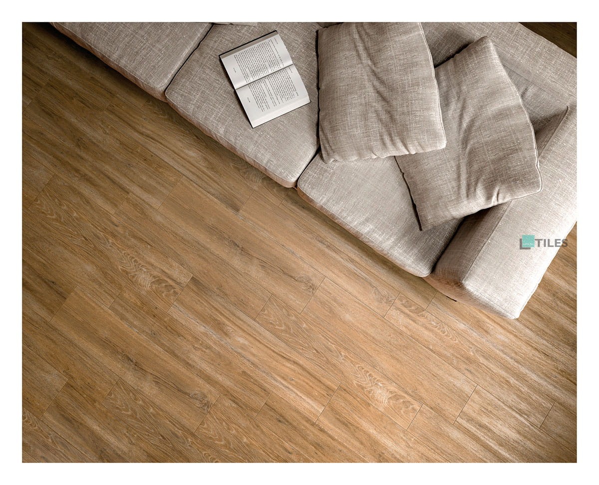 Dlaždice z gresu s vzhledem dřeva v přírodním světle hnědém odstínu. Spojuje vzhled dřeva s odolností gresu – odolná proti oděru a snadno udržovatelná. Skvělá pro vnitřní použití – ideální do obývacích pokojů, ložnic a chodeb.