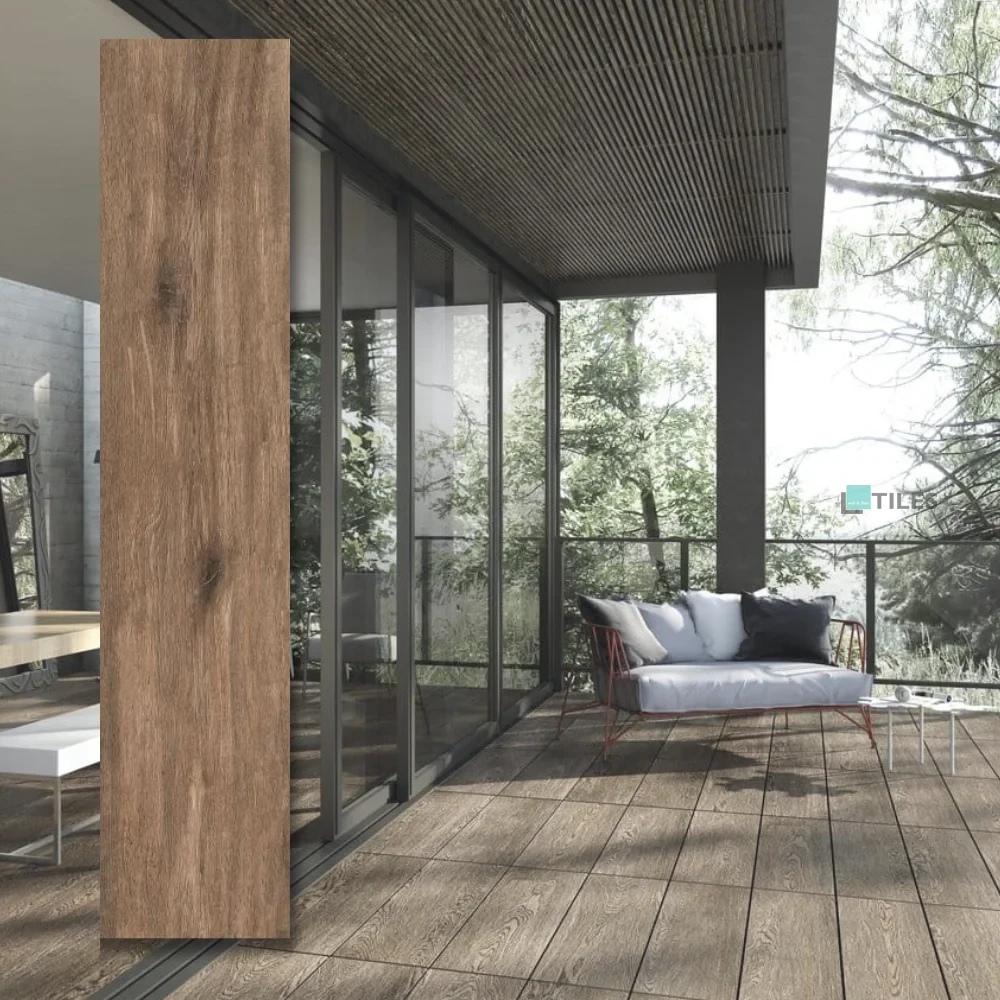 - Příroda vnesená do interiéru: Vzor a barva dlaždice připomínají přírodní dřevo, což dodává interiéru teplo a jedinečný charakter.